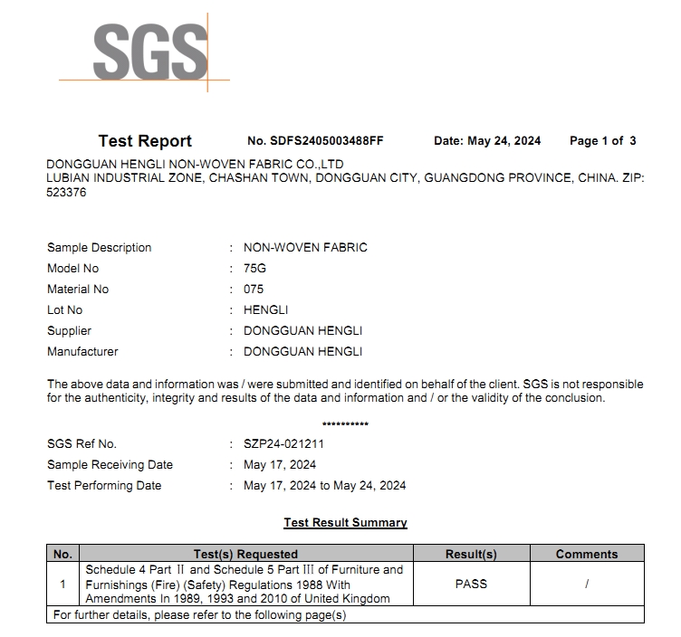 2024年最新版SGS無紡布英標(biāo)防火報告