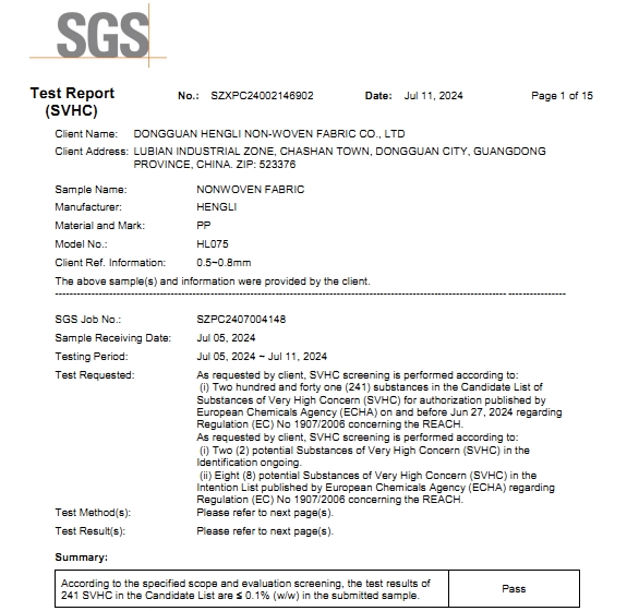 無紡布2024年SGS環(huán)保測試報告